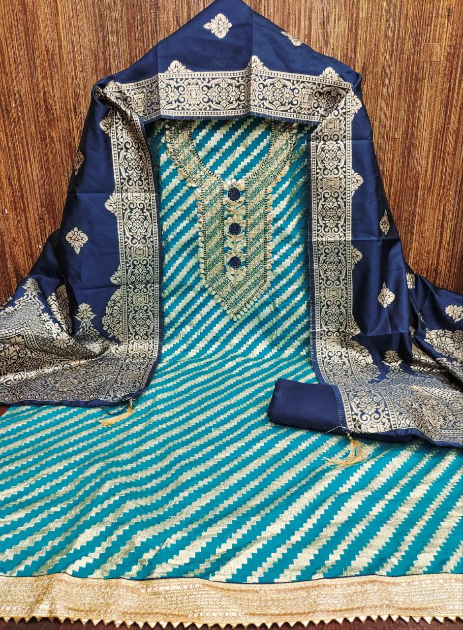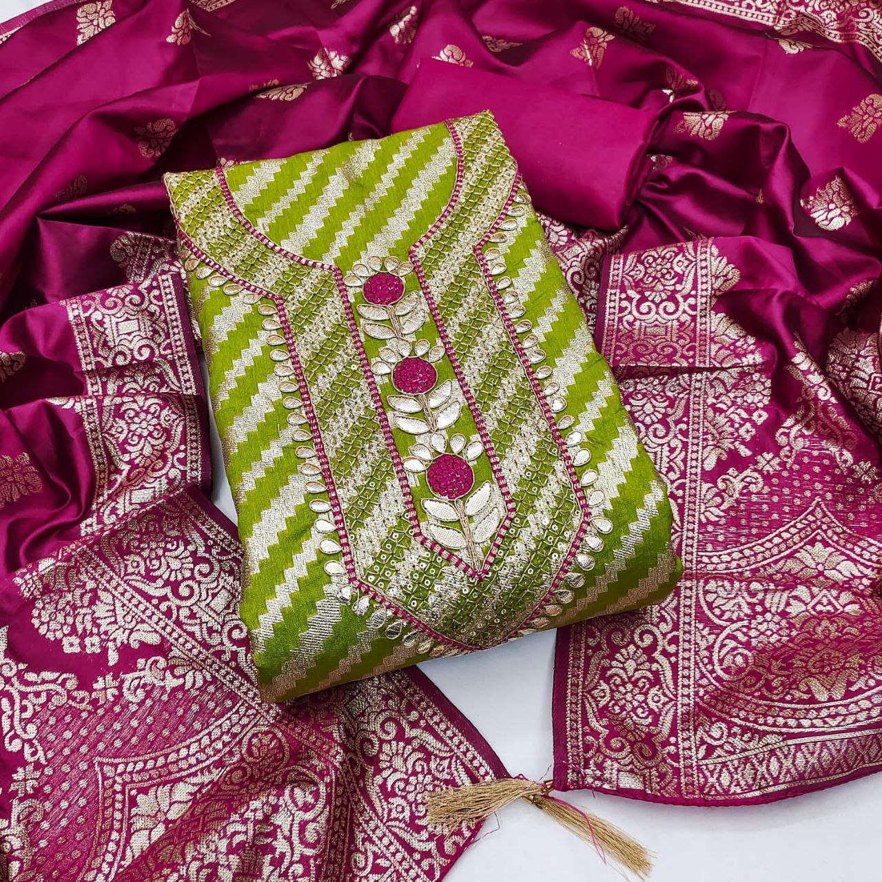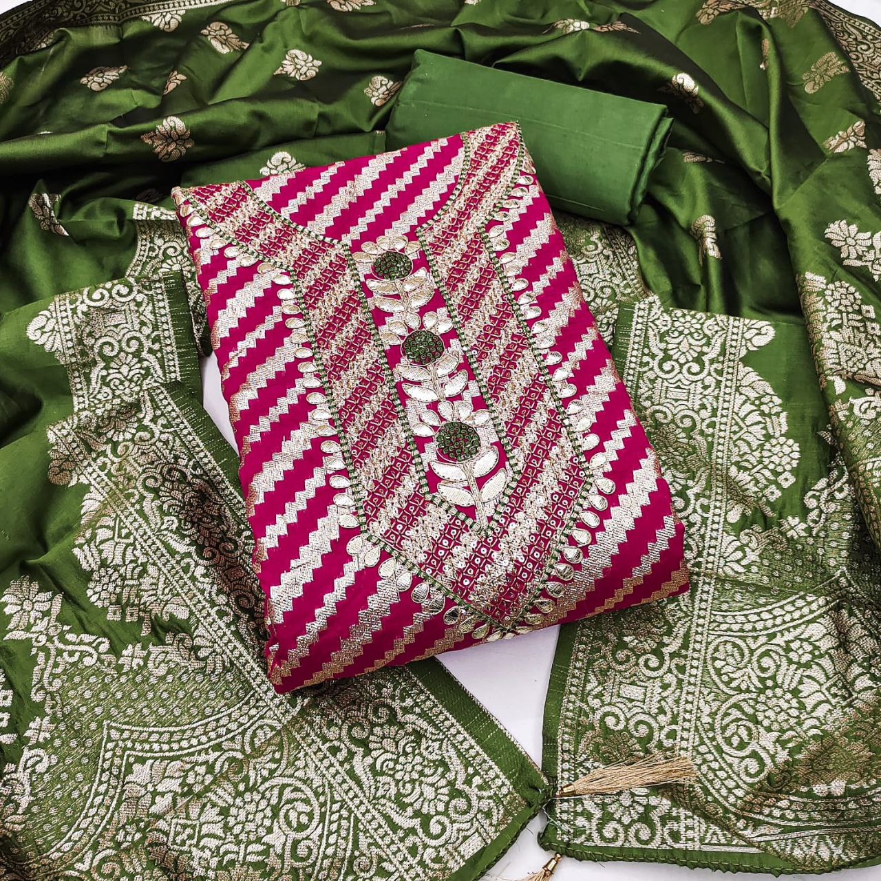 Elevate your ethnic wardrobe with this beautiful women’s unstitched dress material, designed for festive and special occasions. The set features a richly embroidered pink kurta fabric, paired with a solid green bottom and a matching woven dupatta for a complete traditional look.